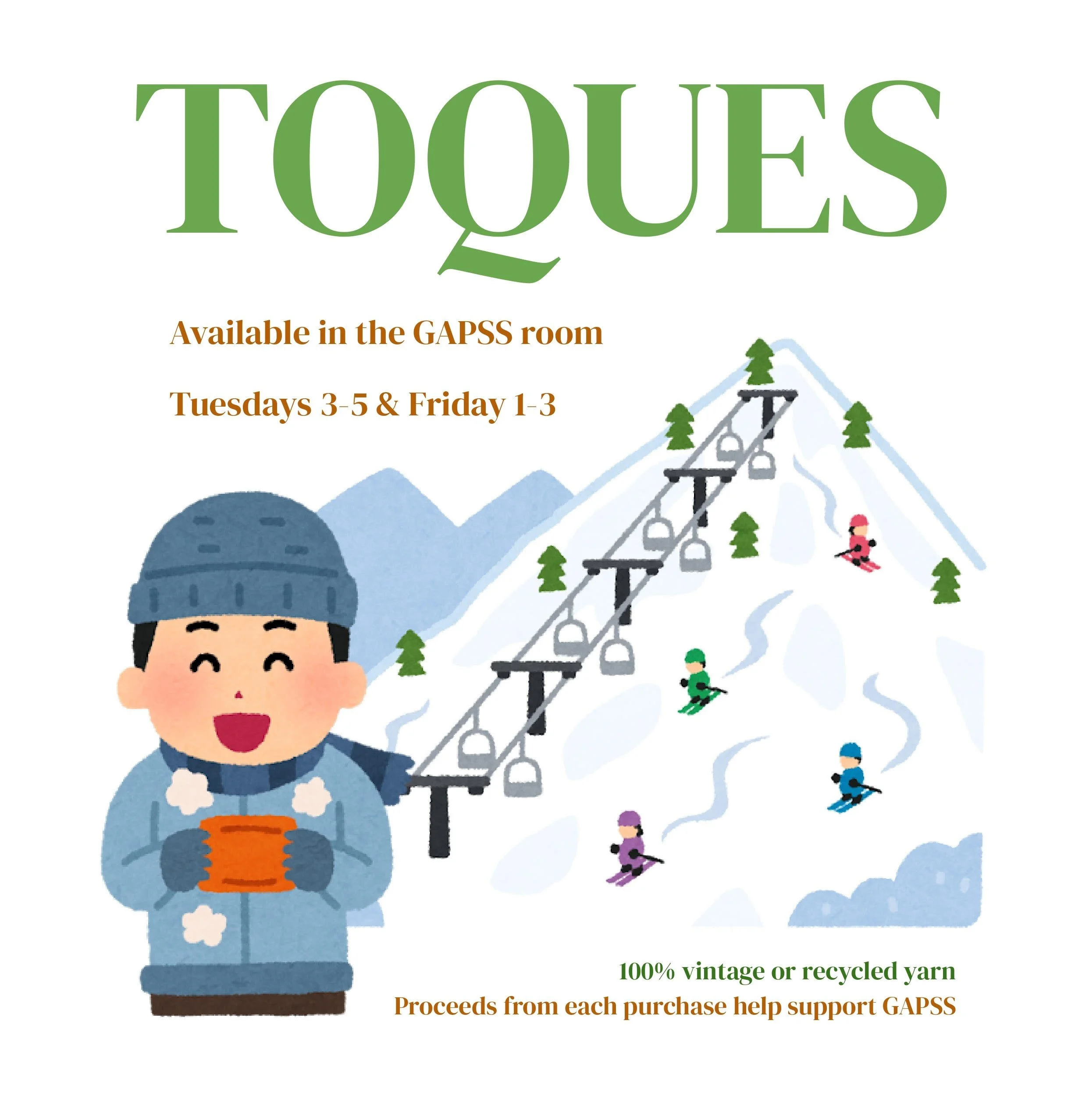 Swing by the GAPSS room on Tuesdays (3:00pm-5:00pm) and Fridays (1:00pm-3:00pm) to purchase a toque handmade by a fellow GAPSS member!
