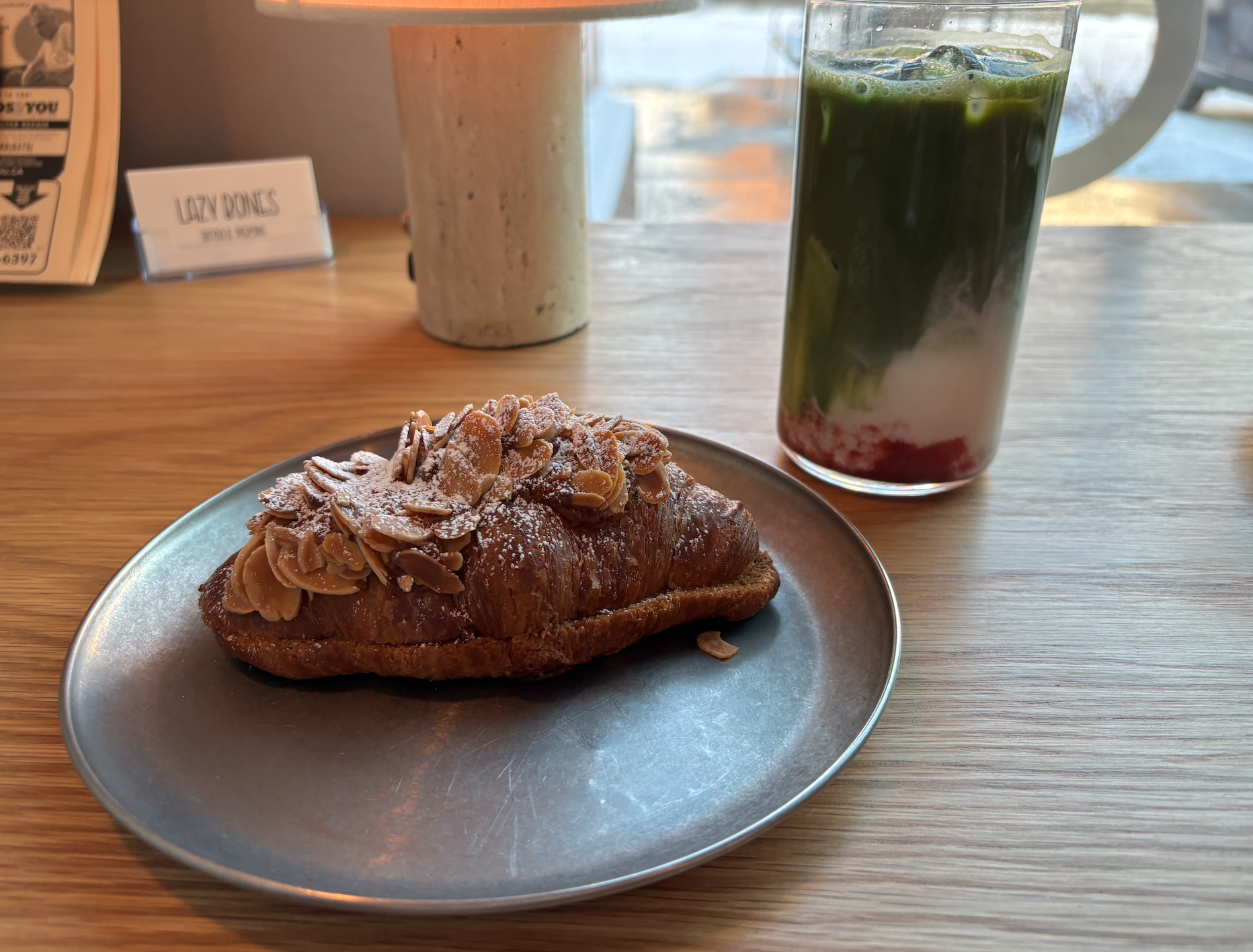 My strawberry matcha ($8.50 before tax) & almond croissant order (I forgot to get the price!).